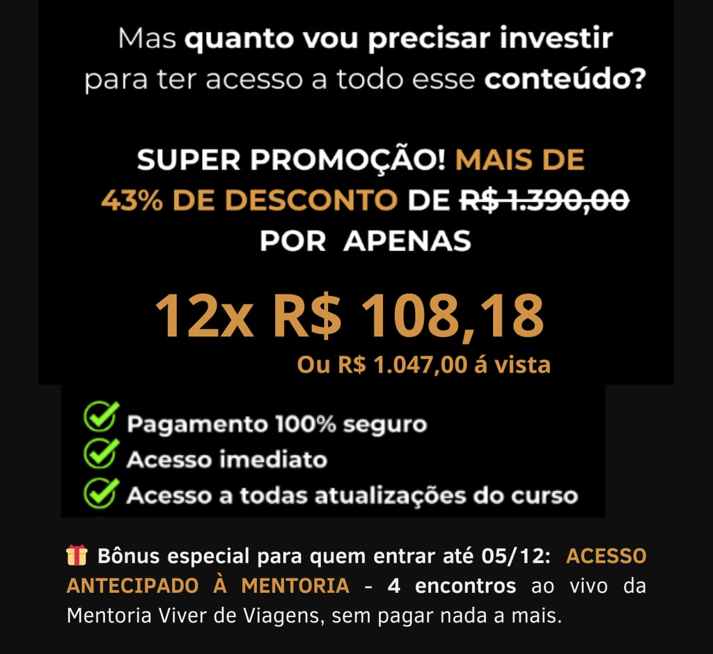 Entre no treinamento agora e garanta 4 encontros ao vivo da Mentoria Viver de Viagens — 2 em dezembro + 2 em janeiro, sem pagar nada a mais.