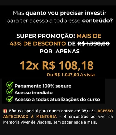 Investe na formação completa — Agente de Viagens Experts + Marketing & Conteúdo — e recebe acesso imediato para assistir às aulas no seu ritmo.