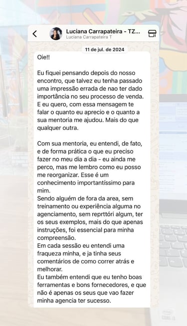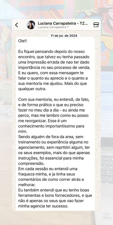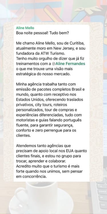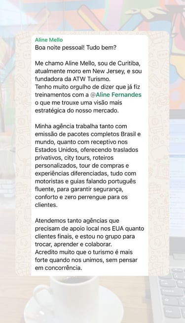 Treinei equipes, criei campanhas que bateram recordes, acompanhei a evolução de profissionais que hoje vivem 100% do turismo — e evoluí meus antigos TT Treinamentos para o que agora é a Mentoria Viver de Viagens, um programa contínuo para quem quer crescer de verdade.